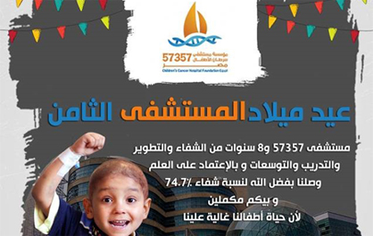 Eight years ago, on July 7th, 2007, the Hospital opened its doors to the public to provide the best quality comprehensive care to all children with cancer free of charge without discrimination. Since then we were committed to a number of goals and promises we pledged to realize. During our 5th anniversary, we announced the recording of an average over-all survival rate of 70%, promising to raising it to reach the developed world rates. Back then, we also revealed our commitment to a number of important capacity and program expansion projects, including the setting up of world accredited training and education programs to breed a new generation of healthcare professionals capable of ushering in a new era for healthcare in Egypt